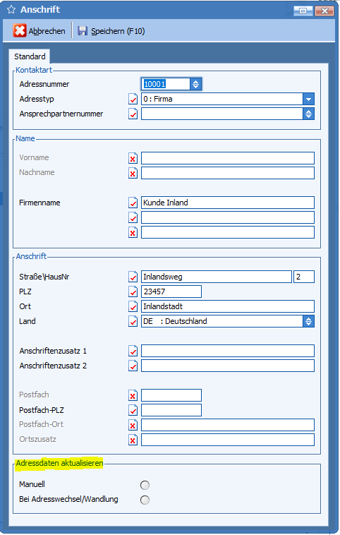 Mit der Revision 47451-Beta haben wir das Verhalten der Radio-Button für die Belegkopfmaske angepasst. Bisher war es so, dass keine Option bei „Adressdaten aktualisieren“ ausgewählt war. Dies ist bei Radio-Buttons nicht möglich, deswegen ist ab sofort standardmäßig der Button „Bei Adresswechsel/Wandlung“ aktiv. Diese Anpassung ändert das Standard-Verhalten der BW nicht!