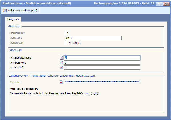 In der Tabelle der Bankstammdaten über „F3“ in die Erfassung der Bankdaten wechseln und die gewünschten Bankdaten hinterlegen: