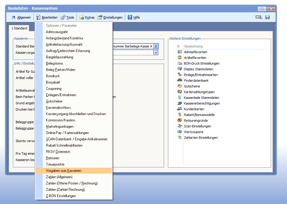 Erweiterung im Bereich Kasse Basisdaten – Vorgaben zum Kassieren