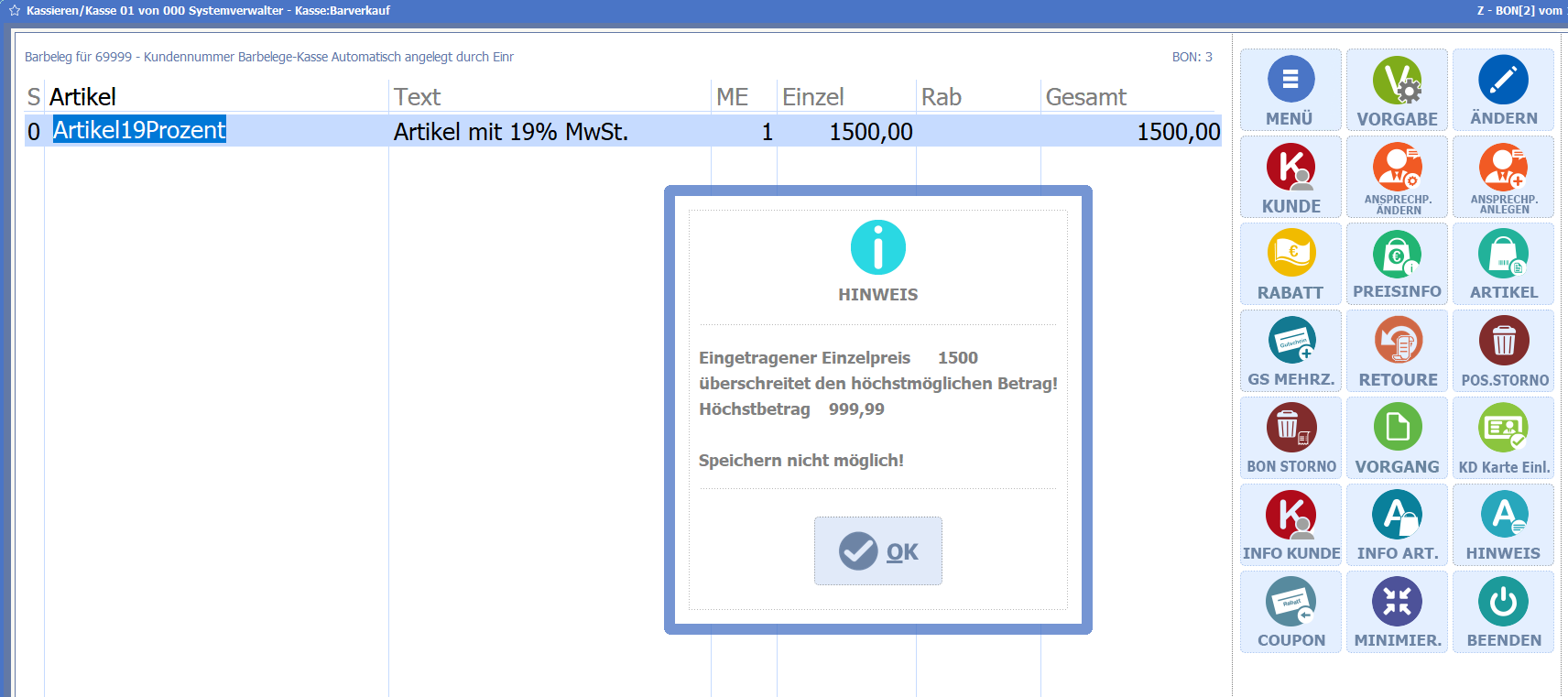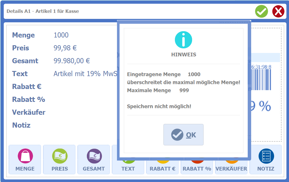 Wird während dem Kassieren die Vorgaben überschritten erscheint eine entsprechende Hinweismeldung.