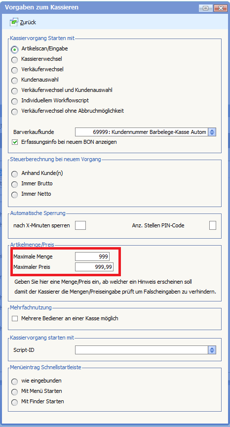 Mit dieser Programmänderung können in der Kasse 4.1 Vorgaben für einen maximalen Preis und einer maximalen Menge gemacht werden.