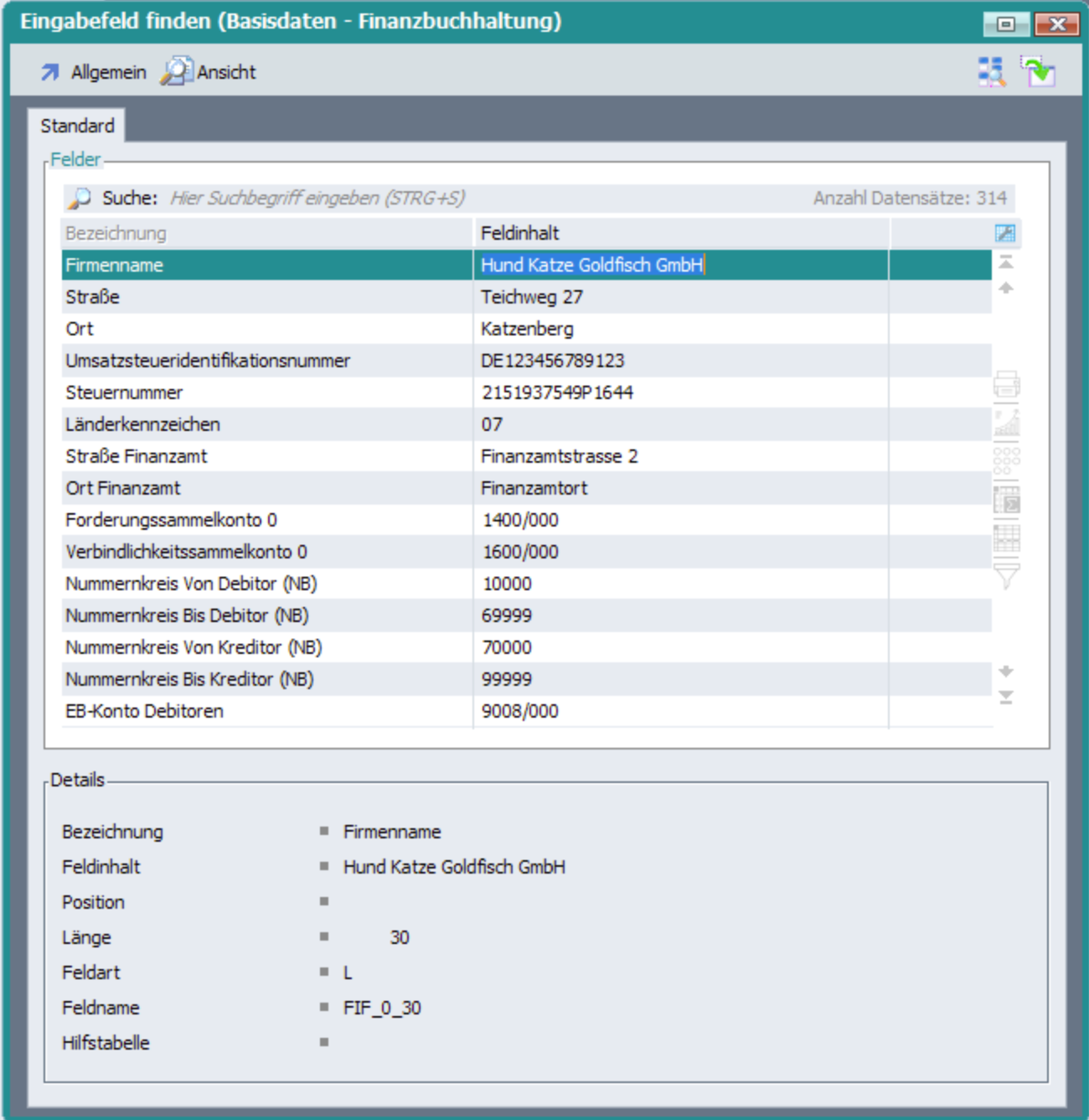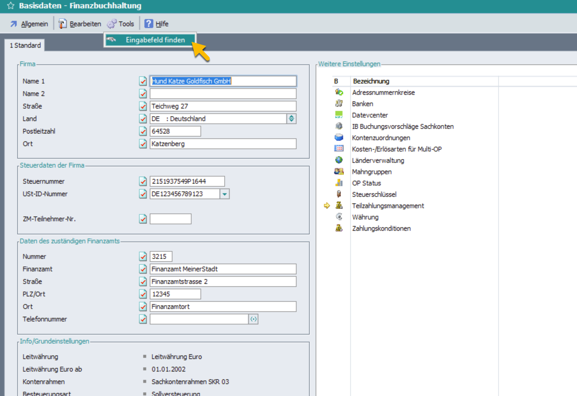 Bisher stand die Funktion „Eingabefeld finden“ (bzw. neu: „Alle Datenfelder anzeigen“) nicht in allen den Basisdaten zur Verfügung (z.B. Finanzbuchhaltung).