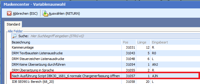 Mit dieser Programmerweiterung ist es möglich, die normale Chargenerfassung nach der Ausführung eines eigenen Scripts zu öffnen. Dafür gibt es das neue MEM-Feld: MEM_31057_1, ANJ „Nach Ausführung Script DBK30_1681_6 normale Chargenerfassung öffnen“.