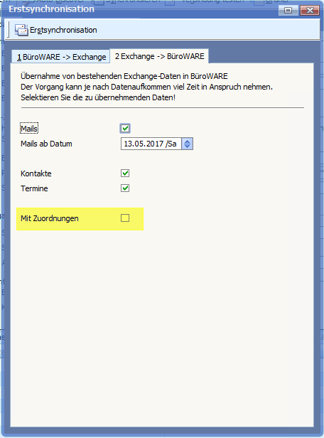 Es gibt im Dialog der Erstsynchronisation der Exchange Schnittstelle das Flag „Mit Zuordnungen“ (J/N).