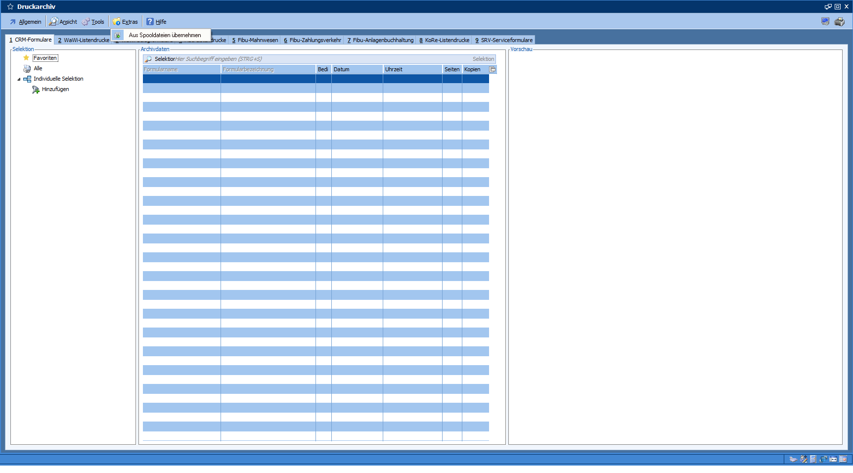 Der Menüeintrag zur Übernahme der Spooleinträge in das neue Druckarchiv öffnet nun einen Dialog zur optionalen Selektion der zu übernehmenden Daten auf Datum, Bediener und Formularbereich. …