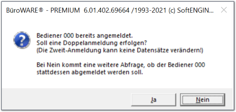 Die Doppelanmeldungs-Hinweisbox wurde so geändert, dass der User sich nun entscheiden kann ob eine Doppelanmeldung erfolgen soll oder stattdessen die klassische Abmeldung/Übernahme des Bedieners 000.
