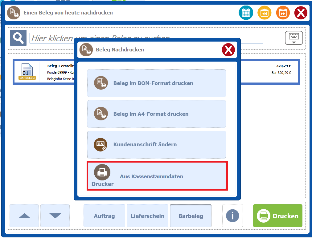 Druckerauswahl beim Nachdrucken eines Bons |