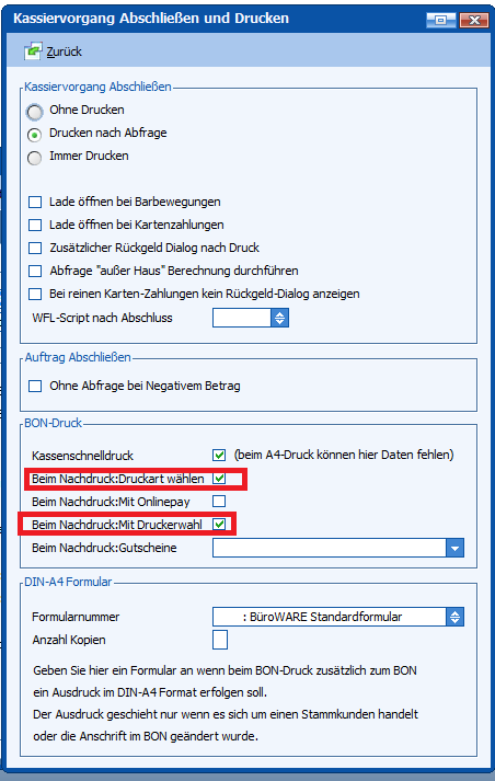 Hierzu gibt es unter „Kassiervorgang Abschließen und Drucken“ in den Kassenbasisdaten das neue Flag „Bei Nachdruck: Mit Druckerwahl“. Zusätzlich muss das Flag „Bei Nachdruck: Druckart wählen“ aktiviert werden.