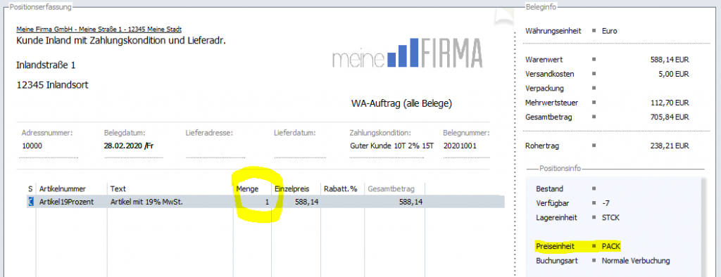 Menge (POS_164_8)= 1 Text Mengeneinheit (POS_689_5) = Artikel-Lagereinheit (ART_1706_5) Umrechnungsfaktor (POS_673_16) = 1