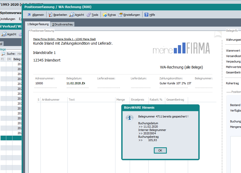 Ab Rev. 51629/Beta und Rev. 51733/Patch gibt es ein Zugriffsrecht um die Erfassung von doppelter Belegnummer2/3 pro Adresse zu unterbinden. Ist dieses Zugriffsrecht aktiviert, und es wird eine doppelte Belegnummer 2/3 pro Adresse erkannt, öffnet sich nach Bestätigung des Hinweises wieder die Belegseite 1 und die Belegnummer 2/3 muss abgeändert werden. …