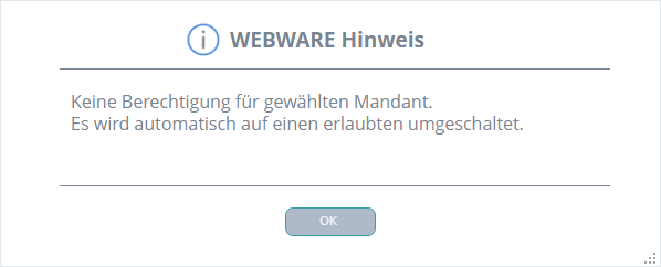 Wird ein Autostartmodul verwendet und der Aufruf wird über die WWAPP ohne Mandanten-Vorgabe ausgeführt, so wurde bisher eine Hinweismeldung angezeigt, das auf einen passenden Mandanten umgeschaltet wird. Diese Hinweismeldung entfällt, wenn der Aufruf mit Mandant 0 erfolgt (Siehe Meldung unten).