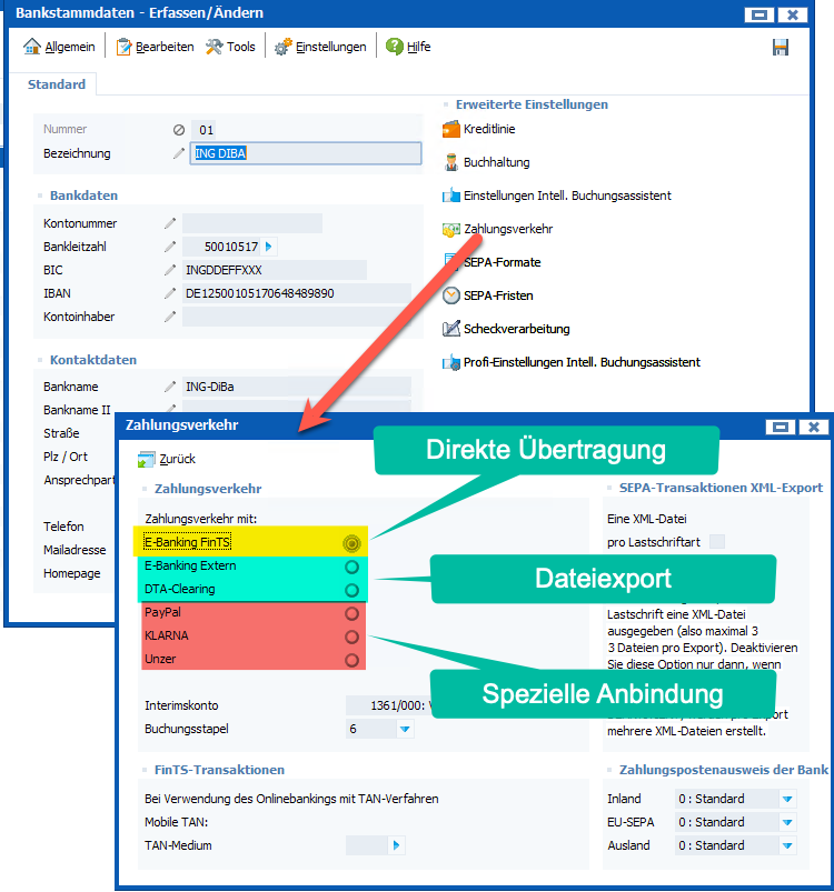 Zunächst muss in den Einstellungen zum Zahlungsverkehr die Variante E-Banking FinTS ausgewählt sein.