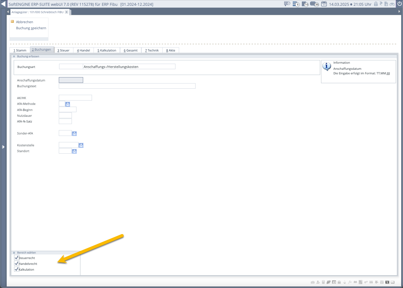 Ab den Revisionen 115054 (MC) und 115055 (IC) wurde in der Anlagenbuchhaltung eine Änderung bei der Bearbeitung von Buchungen eingeführt, die es ermöglicht, unterschiedliche Abschreibungen für Steuerrecht, Handelsrecht und Kalkulation zu buchen.