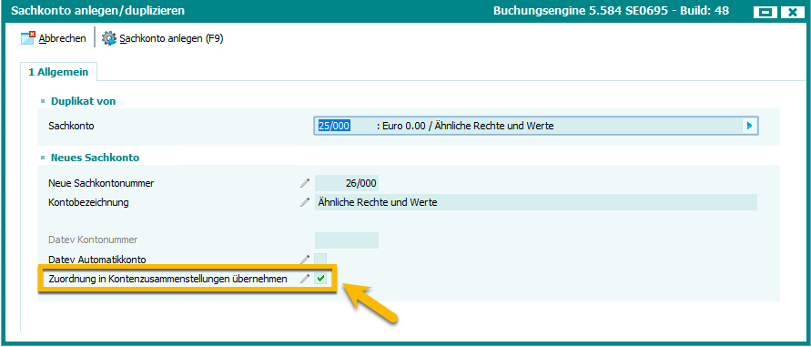 Beim Duplizieren/Neuanlegen eines Kontos werden die Eintragungen in den Kontenzusammenstellungen mit übernommen.