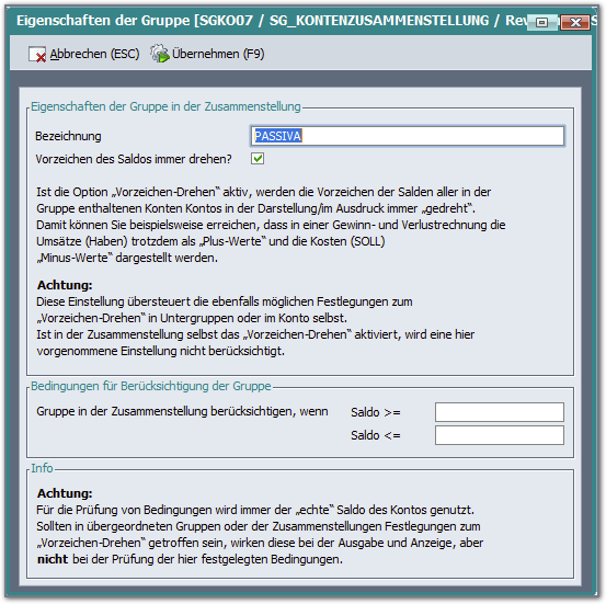 Die Einstellung „Vorzeichen des Saldos immer drehen“ wirkt analog der Einstellung bei der Kontenzusammenstellung, beschränkt sich aber auf den Inhalt dieser Gruppe.