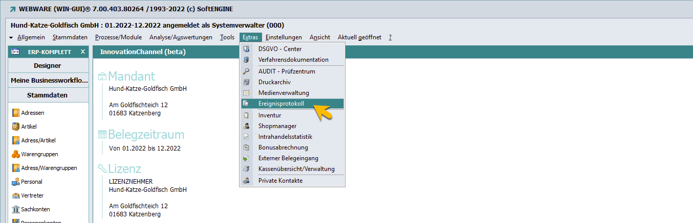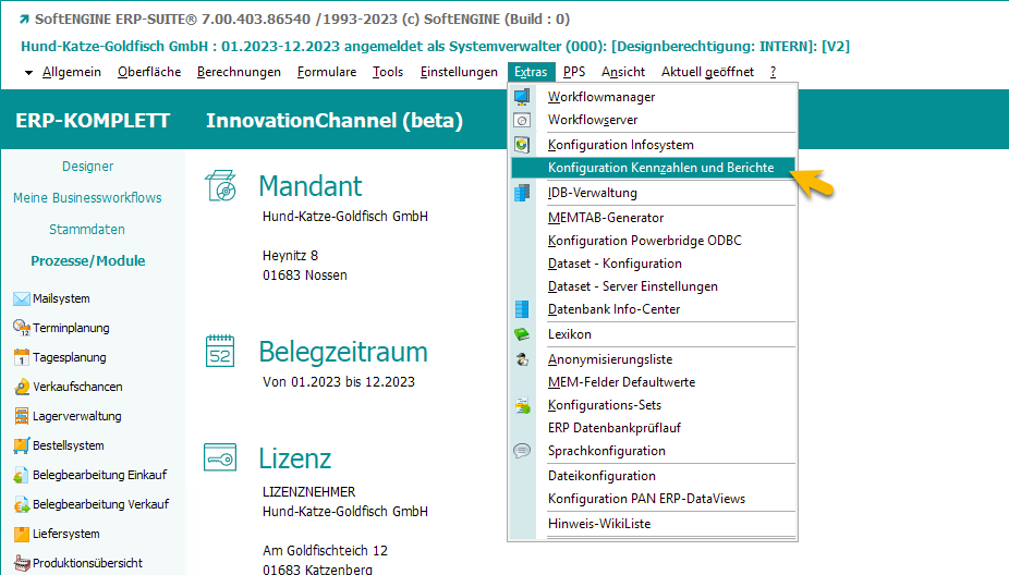 Wechseln Sie dazu in das Menü: Design/Administration und öffnen dort im Menüpunkt „Extras“ die „Konfiguration Kennzahlen und Berichte“.