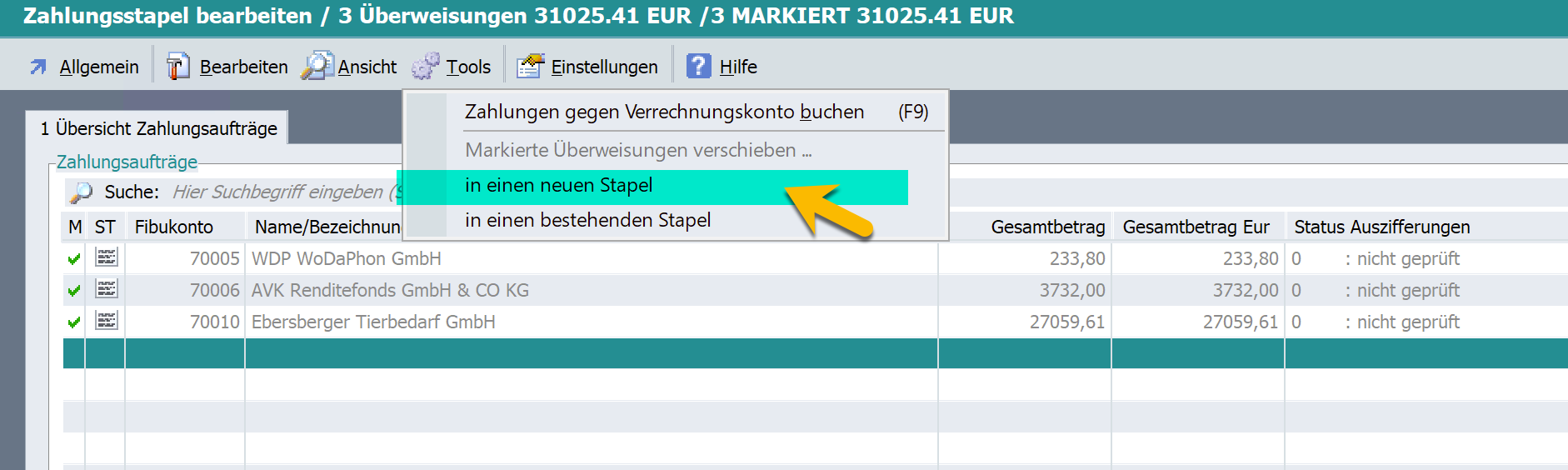 Der Vorschlag wird beim Export bzw. beim Übertragen zur Bank gesplittet.
