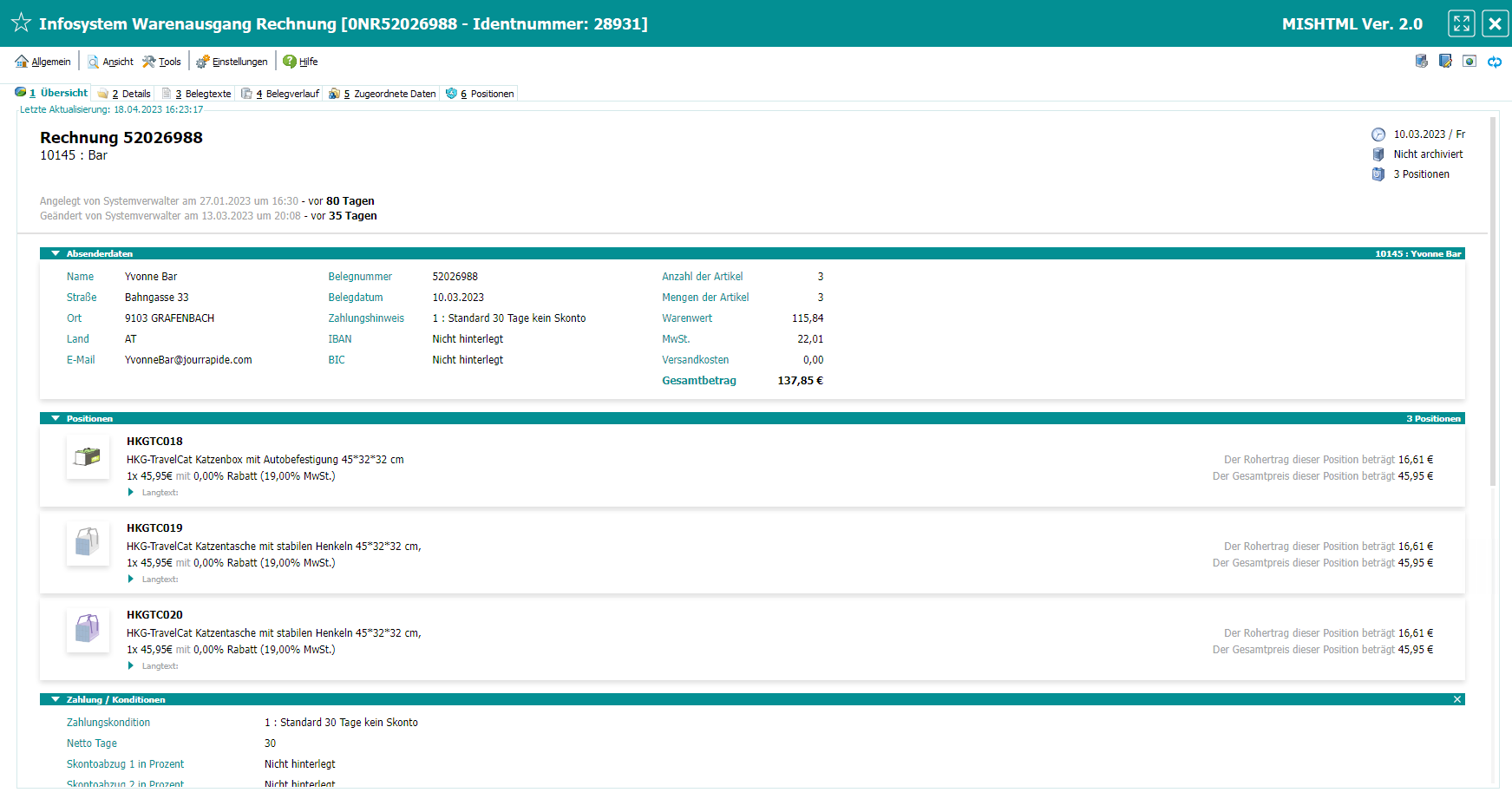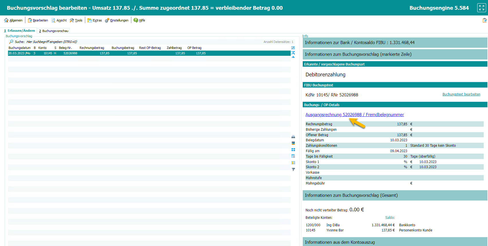 Ist der Buchungsvorschlag geöffnet, gelang man durch Anklicken des Links „Ausgangsrechnung xxxxx“ direkt ins MIS.