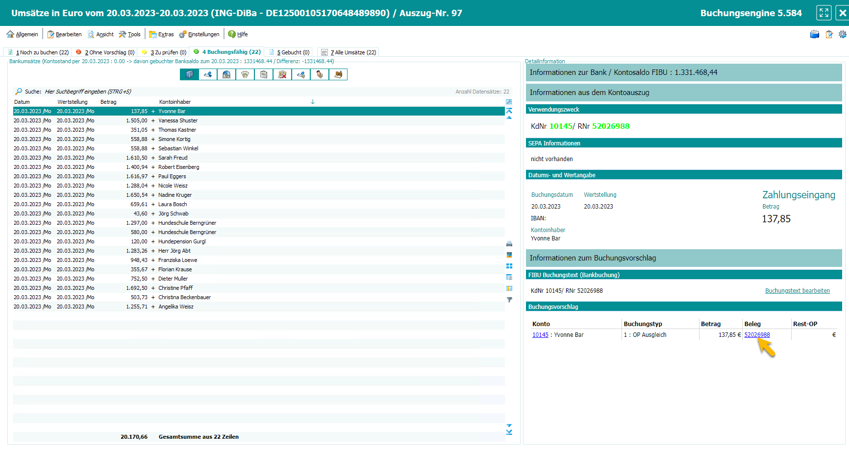 Bei einem Zahlungseingang wird die Belegnummer 3 angegeben, allerdings nicht vollständig.
