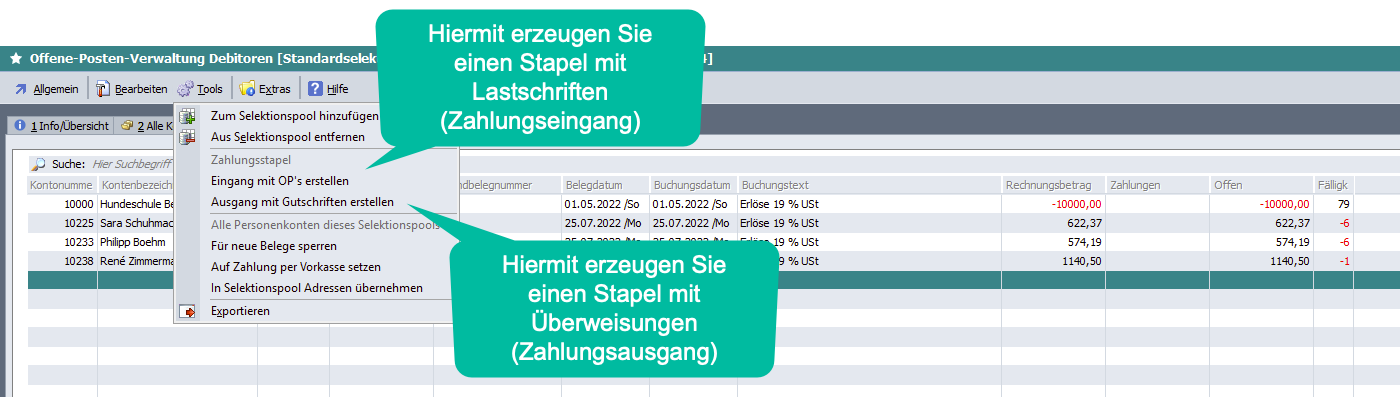 Ab Revision 70730/BETA gibt es die Möglichkeit im Dialog „Buchungsvorschlag bearbeiten“ unter Tools -> Offene Posten zur Zahlung vorschlagen, auch Belege anhand der Belegnummer 1 in die Tabelle zu laden oder zu importieren.