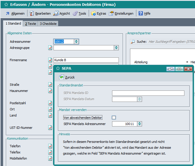 Ist in der Adresse kein Standardmandat (ADR_4108_30) gesetzt und das Flag „Von abweichendem Debitor“ (ADR_5358_1) deaktiviert, wird das Mandant aus der Adresse, welche im neuen Feld „SEPA Mandats Adressnummer“ ADR_6353_8 hinterlegt ist, gezogen. …