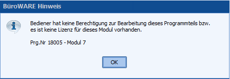 „Bediener hat keine Berechtigung zur Bearbeitung dieses Programmteils, bzw. es ist keine Lizenz für dieses Modul vorhanden.“.