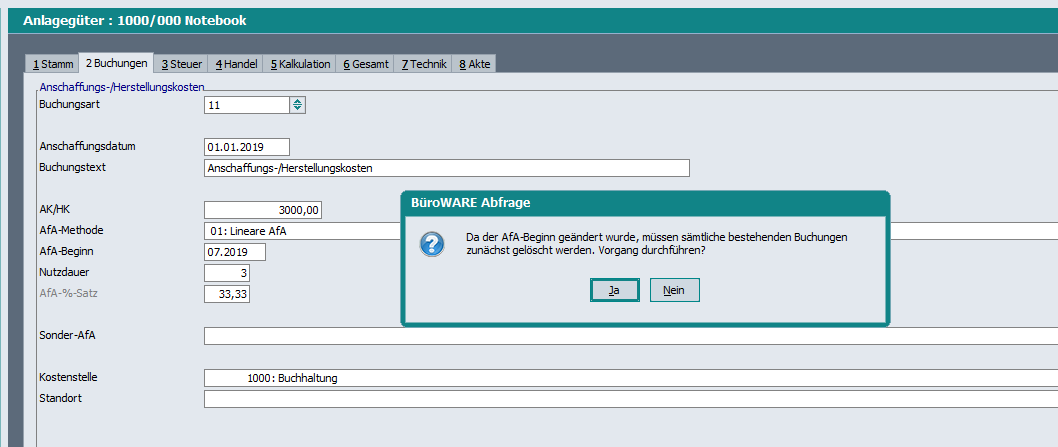 Wird innerhalb der Anlagenbuchhaltung der Abschreibungsbeginn einer bestehenden Anschaffungs-/Herstellungskosten Buchung (Buchungsart 11) nachträglich verändert, erscheint beim Speichern der Buchung ab Rev. 51852/Beta und Rev. 51866/Patch eine Abfrage. Wird diese mit „Ja“ bestätigt, werden sämliche bestehenden Buchungen gelöscht und auf Basis der neuen Daten neu erstellt.