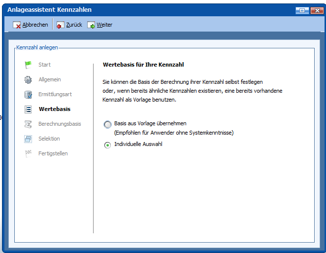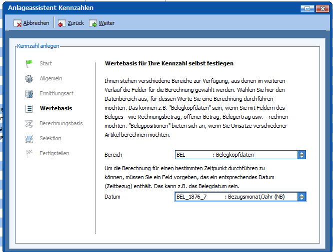 Im Neuanlageassistent für Kennzahlen wurden Schreibfehler behoben. Außerdem wird die Variablenauswahl auf Bereich und Nur Datum beschränkt.