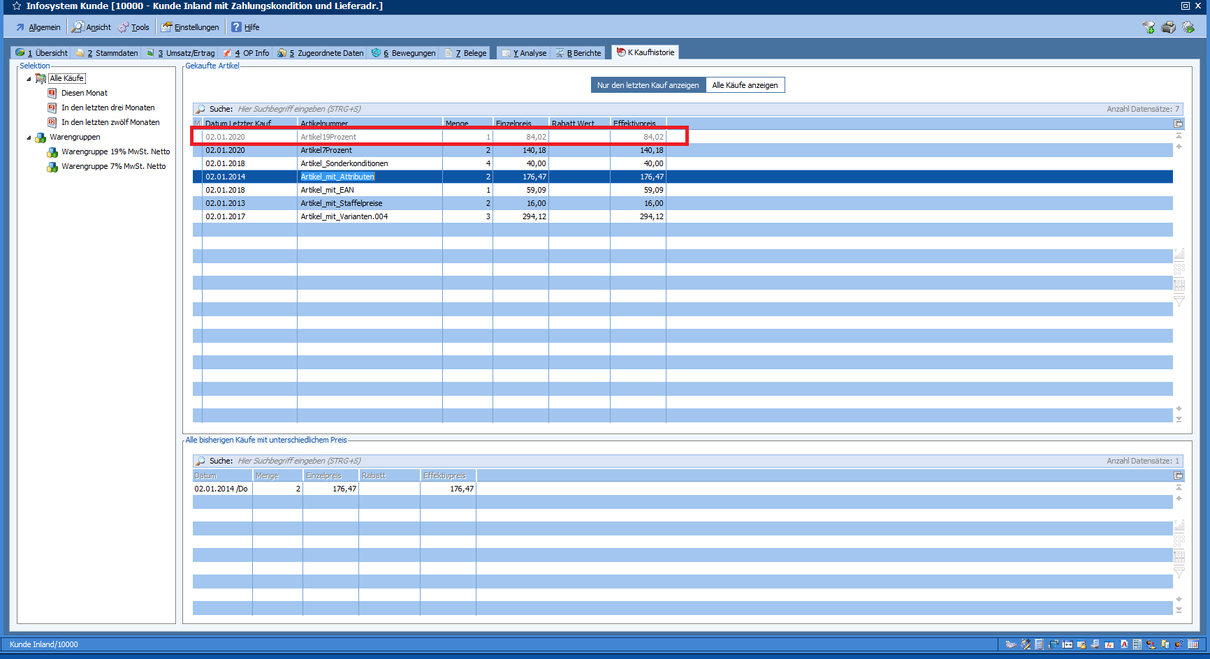 Mit dieser Programmänderung gibt es im Infosystem der Adresse die neue Karteikarte „Kaufhistorie“. Auf dieser Karteikarte werden alle Artikel angezeigt, die die Adresse bisher gekauft hat.