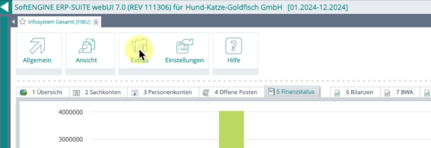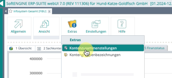 Grundsätzlich benutzen wir in diesem System für alle Darstellungen in dieser Form die sogenannten Kontenzusammenstellungen. Diese Kontenzusammenstellung finden Sie im Infosystem unter dem Menü „Extras“