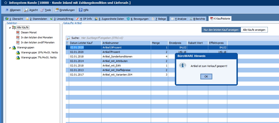 Mit dieser Programmänderung wird in der Kaufhistorie im Infosystem der Kunden auf gesperrte Artikel geprüft.
