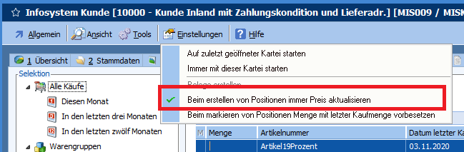 Mit dieser Programmänderung gibt es in der Kaufhistorie unter Einstellungen eine neue Einstellung, um beim Erstellen oder Hinzufügen von Positionen den Preis zu aktualisieren.