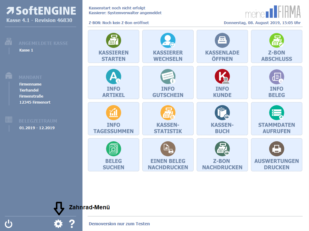 Der Aufruf erfolgt über das Einstellungen/Zahnrad-Menü im Kassendesktop.