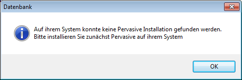 Ab dem 06.11.2019 werden alle Setups direkt nach dem Starten prüfen, ob eine Pervasive-Installation vorhanden ist und ob diese läuft. Sollte dies nicht der Fall sein, wird folgende Fehlermeldung ausgegeben: