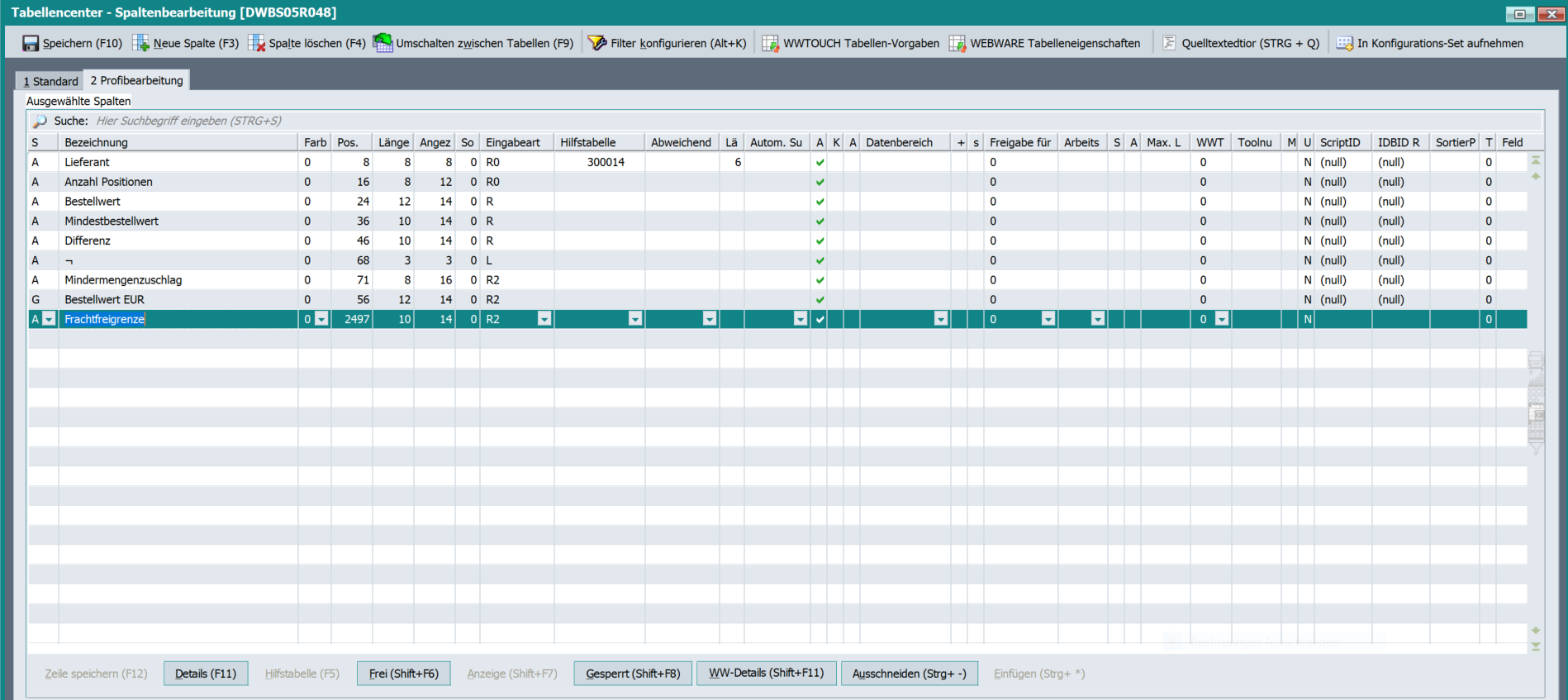 Sobald Sie sich im Bestellvorschlag befinden, können Sie ab sofort im Tabellencenter mit der korrekten Angabe der Position (2497) und Länge (10) das Feld auch dort in der Anzeige hinzufügen: