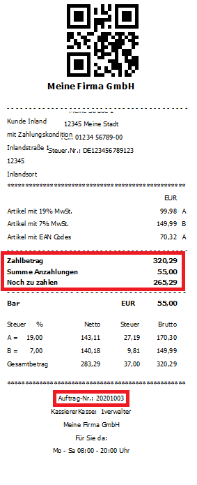 Auf dem Auftragsbeleg werden nun der Zahlbetrag, die Summe der Anzahlungen und der Betrag der noch zu zahlen ist angedruckt. Die Zahlart mit der die Anzahlung gezahlt wurde, wird auch angedruckt. …