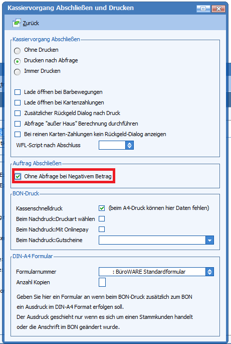 Hierzu gibt es unter „Kassiervorgang Abschließen und Drucken“ in den Basisdaten der Kasse das Feld „Ohne Abfrage bei Negativem Betrag“.