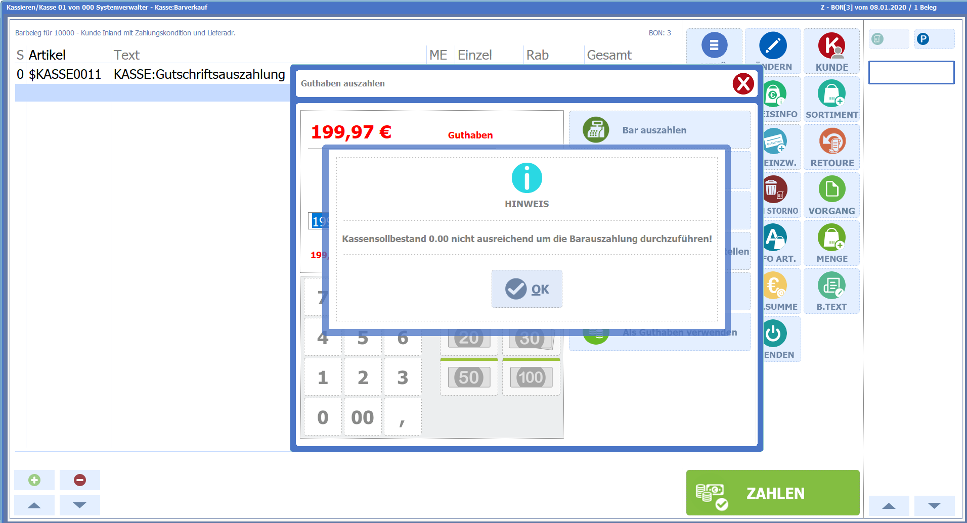 Ab Rev. 50567/Beta und Rev. 50689/Patch sind Barauszahlungen nur noch bis zur Höhe des tatsächlichen Barbestandes möglich. Überschreitet der gewünschte Auszahlungsbetrag den Barbestand, erscheint ein entsprechender Hinweis und es muss auf andere Zahlungsmöglichkeiten, wie Gutschein, Kartenzahlung, oder Guthaben zurückgegriffen werden.