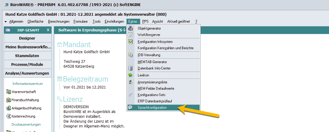 Sie finden im Designer im Menüeintrag „Extras“ ➜ „Sprachkonfiguration“ eine neues Modul für die Verwaltung von Sprachen.