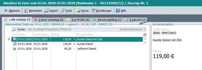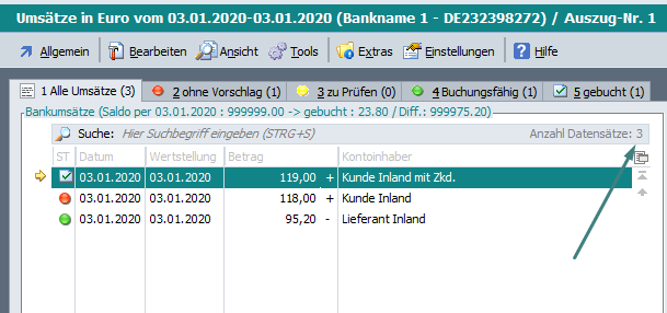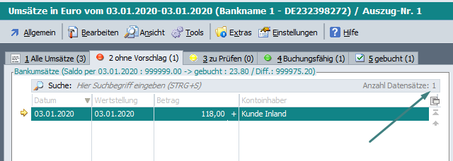 Es wurde auf allen Karteikarten die Anzahl der Datensätze der Karteikarte „1 Alle Umsätze“ angezeigt.