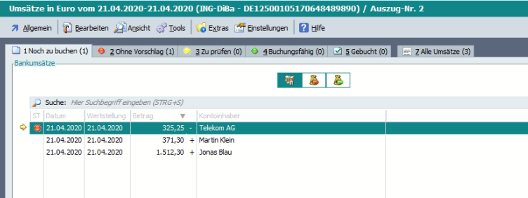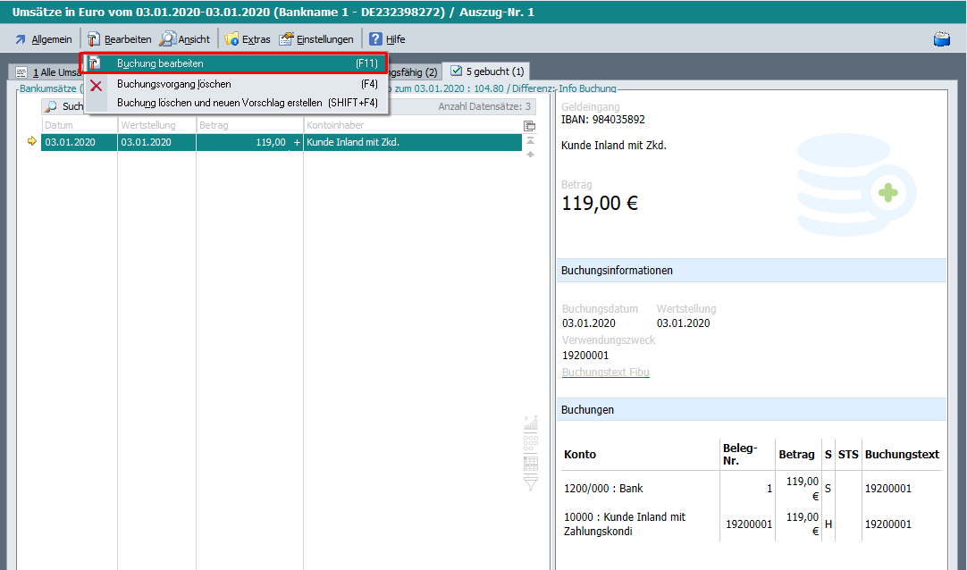 Buchungen können im Kontoauszug nur dann bearbeitet werden, wenn der Kontoauszug innerhalb der Buchungserfassung geöffnet wird.