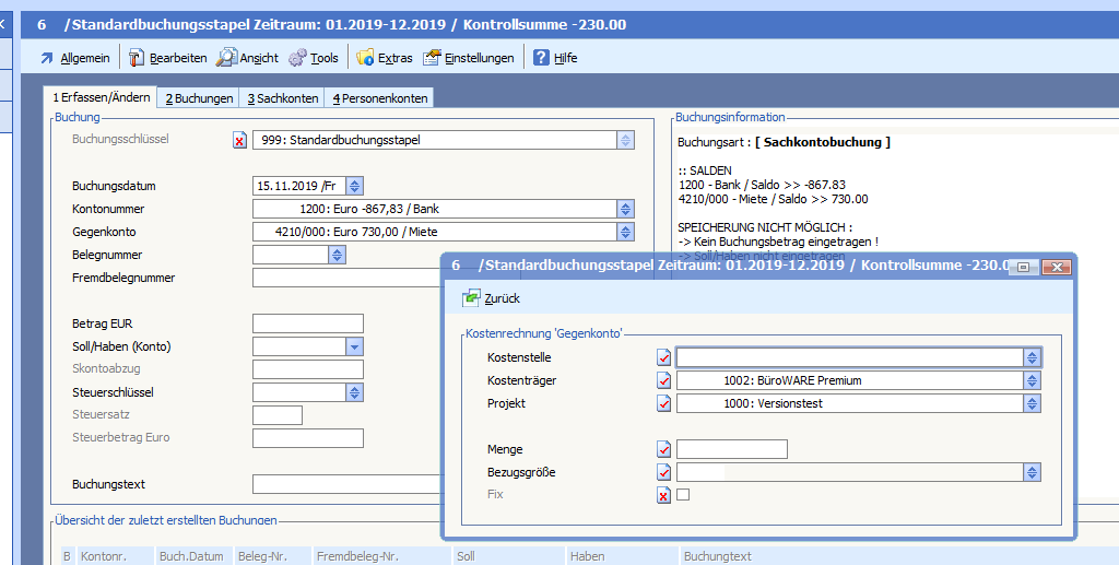 Wurde in den Eigenschaften des Buchungsstapels ein Sachkonto mit hinterlegter Kostenstelle zur Vorbesetzung eingetragen, wurde bei Erfassung der Buchung, die im Sachkonto eingetragene Kostenstelle nicht in die Buchung übernommen. Dies wurde mit Revision 50737/Beta und 50738/Patch behoben.