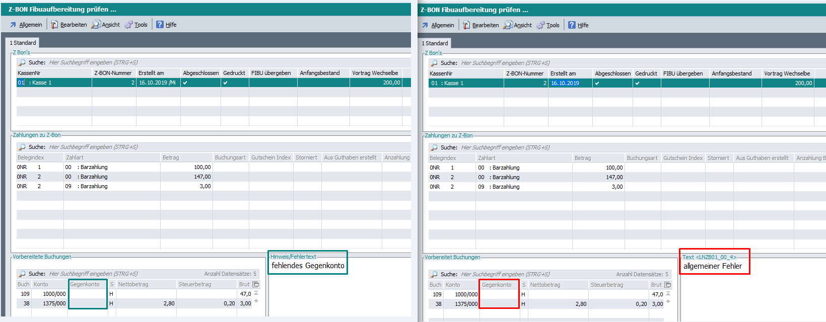 Wird bei der Übernahme des Kassenberichtes in die Finanzbuchhaltung festgestellt, dass eine Verbuchung nicht möglich ist, kann man im Übernahmedialog unter „Tools“, die fehlerhaften Buchungen anzeigen lassen. Im Falle von fehlenden Gegenkonten erscheint ab Revision 50966/Beta und 50967/Patch der Hinweis „fehlendes Gegenkonto“. (Der Hinweistext in älteren Versionen lautete „allgemeiner Fehler“).