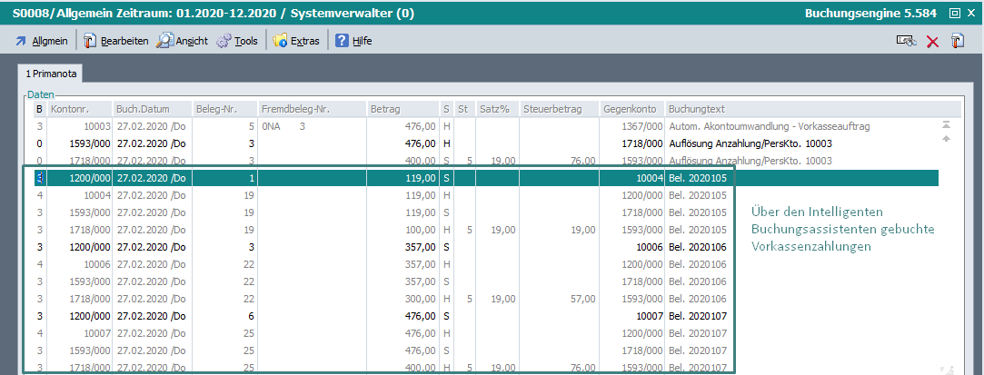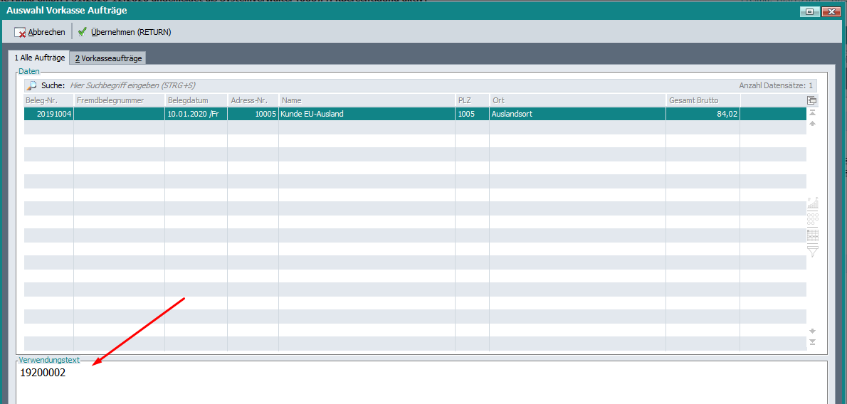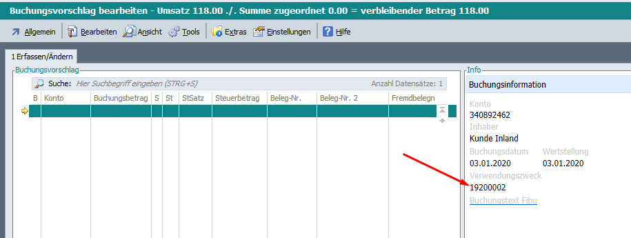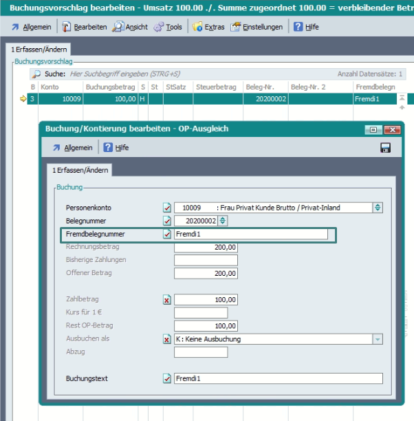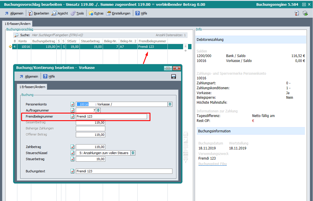 Sowohl beim automatischen Buchungsvorschlag als auch beim manuellen Erfassen einer Vorkassezahlung, wurde die Fremdbelegnummer nicht in den Buchungsvorschlag übernommen.