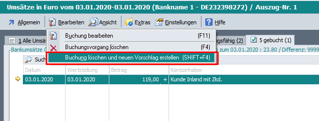 „Buchungsvorschlag löschen und neuen Vorschlag erstellen (SHIFT+F4)“Â