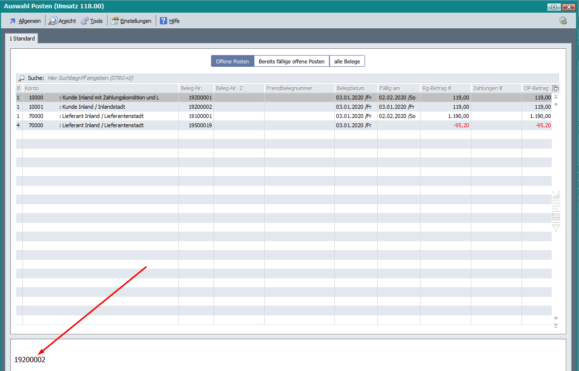 Darüber ist es möglich anhand der Belegnummer 1, Belegnummer 2 oder der Fremdbelegnummer / Belegnummer 3 den Offenen Posten zu suchen.