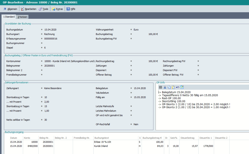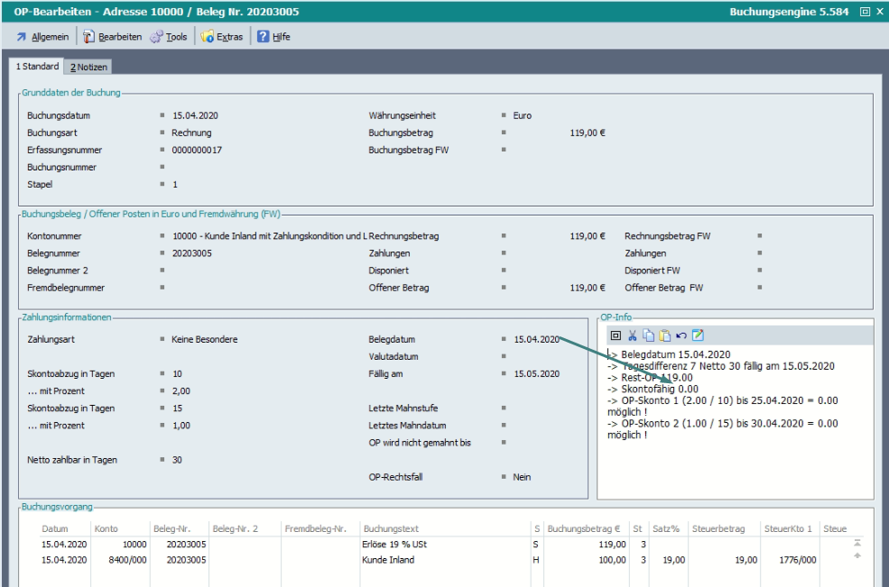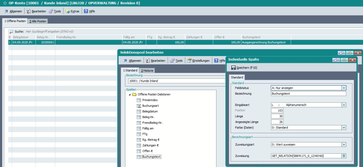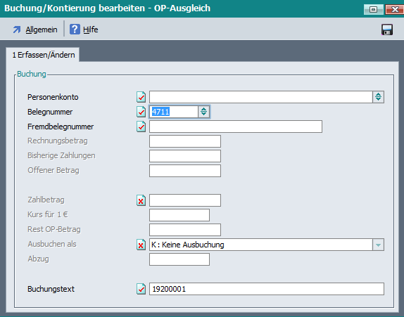 Wenn im Dialog „Buchung/Kontierung bearbeiten – OP-Ausgleich“ eine ungültige Belegnummer eingetragen wird, werden weitere Felder der Maske „Auf Anzeige“ gesetzt.