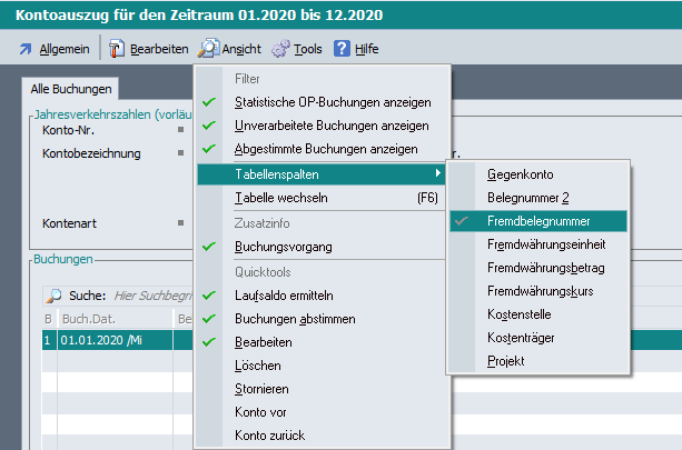 Ab Revision 51976/BETA und 52762/PATCH wird im Kontoauszug unter Ansicht -> Tabellenspalten auch die Fremdbelegnummer/Belegnummer 3 zum Ein-/Ausblenden angeboten.