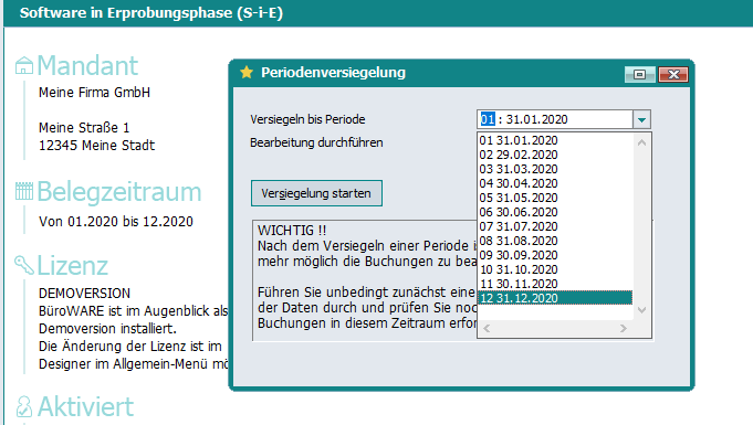 Ab Rev. 52578/Beta und Rev. 52573/Patch wurde die Periodenauswahl bei der Versiegelung auf 1-12 reduziert, da Periode 13 und Periode 14 zwar journalisiert, aber nicht versiegelt werden können.