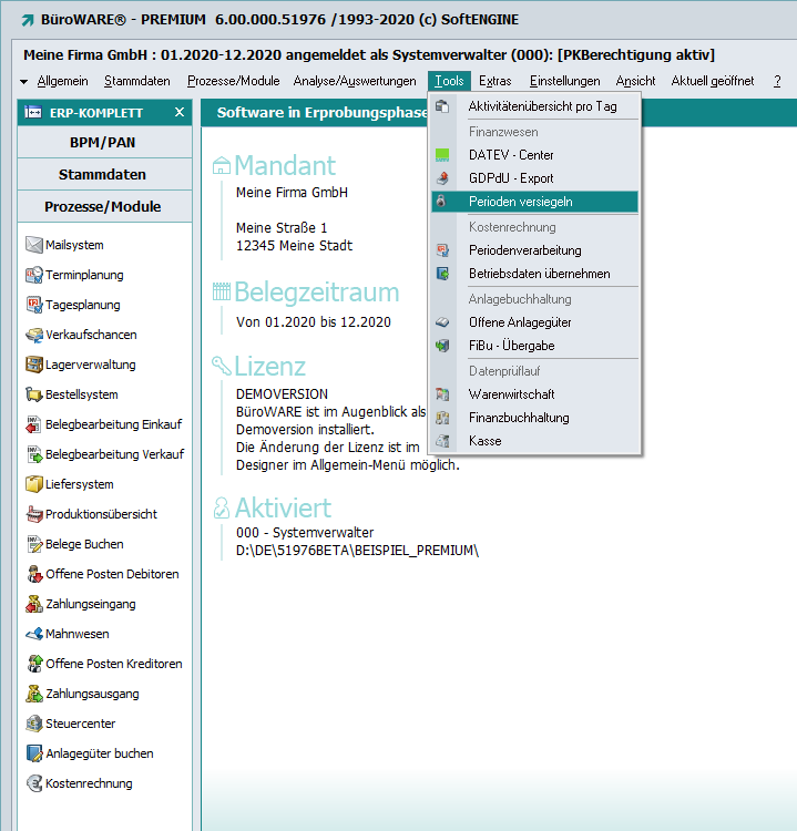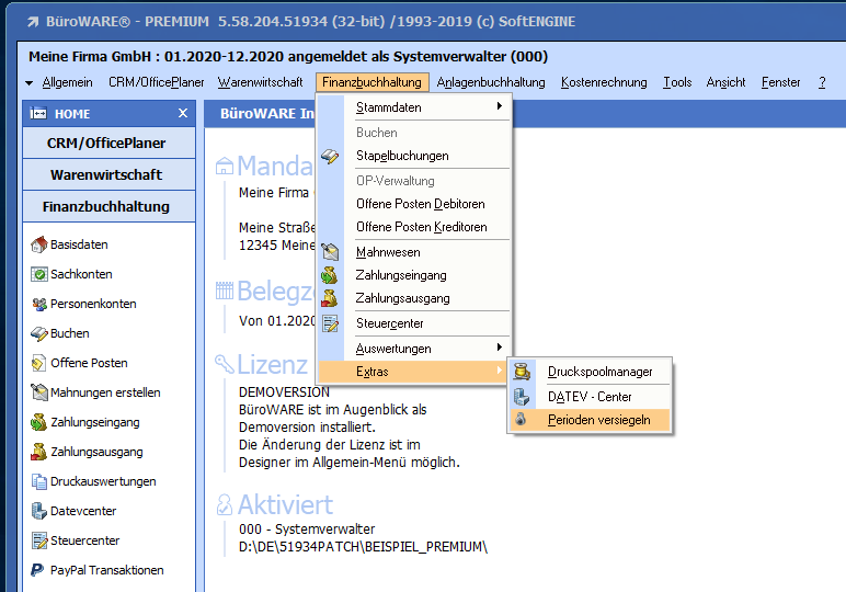 Ab Rev. 51976/Beta und 51934/Patch steht die Periodenversiegelung auch innerhalb der Finanzbuchhaltung zur Verfügung.